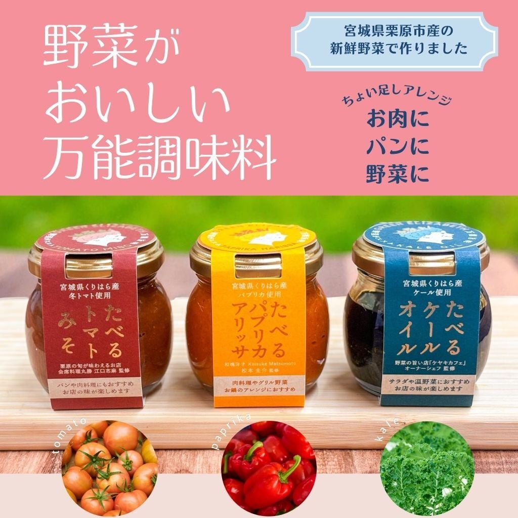 人気の万能調味料「たべるケールオイル」と「たべるトマトみそ」、「たべるパプリカアリッサ」の食べ比べセットです。